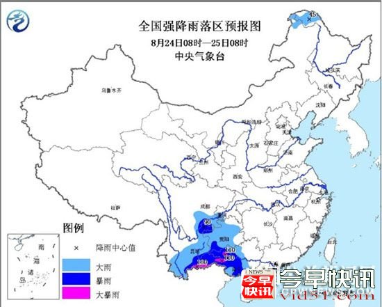 中央气象台8月24日06时发布暴雨黄色预警:预计8月24日08时至25日08时,广东西南部、广西西部和南部、海南岛西北部、云南南部和东部、四川东南部、贵州大部等地有大到暴雨,其中,广西西部、云南东南部等地的部分地区有大暴雨(100~180毫米),上述大部地区有短时强降水,小时最大降水量50~70毫米。