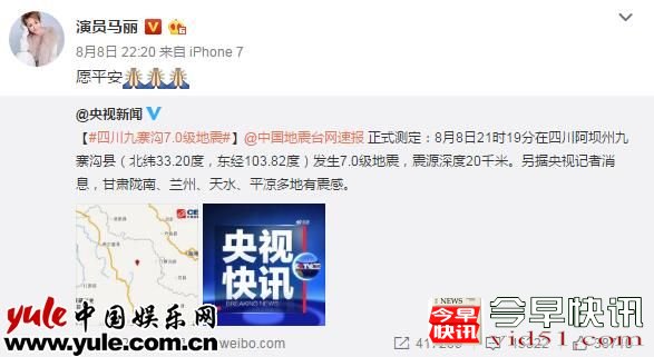 08月08日21时19分在四川阿坝州九寨沟县发生7.0级地震,震源深度20千米,马丽在第一时间转发相关讯息并为灾区祈福:“愿平安(保佑)”。