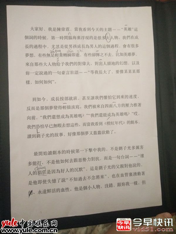 不久前,陈伟霆在电视剧《橙红年代》开机发布会上的一段演讲,普通话发音标准进步神速,惊呆了一票观众。近日有发布会工作人员曝光了陈伟霆当天的演讲稿手稿,并透露陈伟霆在发布会前不仅一遍又一遍练习,还反复修改稿件内容,更在不少字上标注了汉语拼音,其认真敬业的态度受到粉丝一致赞赏。陈伟霆曾在采访中有提到,现阶段非常希望能够在现代剧中自己来配音,看来的确是为此做了不少努力。