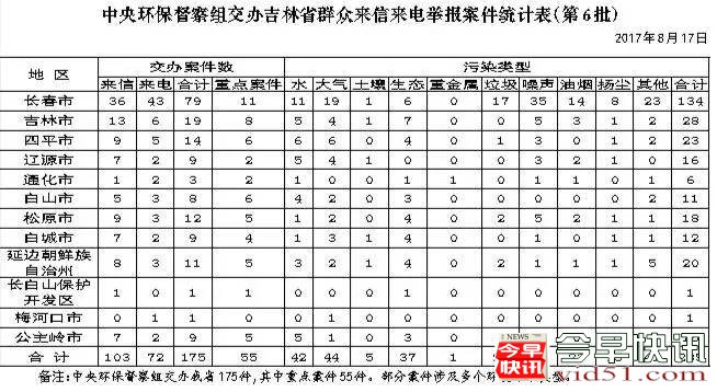 8月17日15时,我省接到中央环保督察组交办的第六批案件,共计175件。其中,重点案件55件。长春市79件(重点案件11件)、吉林市19件(重点案件8件)、四平市14件(重点案件6件)、辽源市9件(重点案件2件)、通化市3件(重点案件2件)、白山市8件(重点案件6件)、松原市12件(重点案件5件)、白城市9件(重点案件4件)、延边州11件(重点案件5件)、长白山保护开发区1件(重点案件1件)、梅河口市1件、公主岭市9件(重点案件5件)。