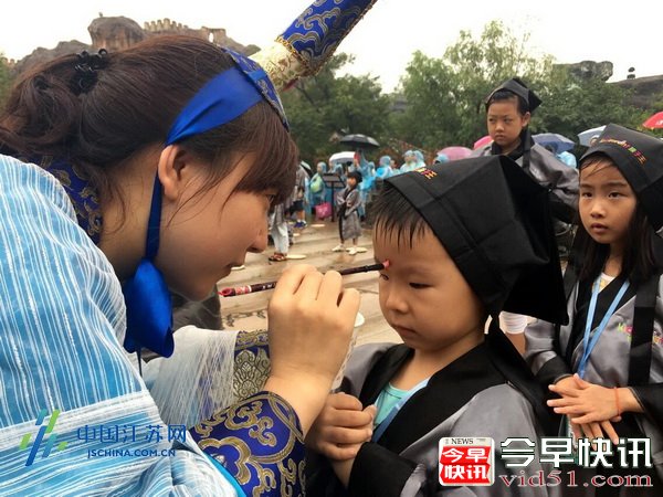 孔子神位,双膝跪地,九叩首;然后是拜先生,三叩首,拜完先生,学生向先生赠送六礼束脩。“朱砂开智”就是用朱砂为刚刚入学的孩子的额头正中点上红痣,这又称之为“开天眼”。其寓意着孩子从此眼明心明,好读书,读好书。在淹城春秋乐园仪式现场,165名6岁左右的适龄入学孩子进行“净手”、“正衣冠”、“行拜师礼三拜九叩”、“朱砂开智”四个环节,虽然下着雨,但是每个孩子都很认真,在老师的指引下有序有礼的完成仪式的每个动作。6岁的孙润璟还有一周就要走进小学的课堂,开始人生最重要的阶段,对此他的爸爸孙健表示,希望经过“入学礼”后,能让孩子明白上学的意义,并懂得“尊师重教”的意思。“这个活动很好,应该提倡每个小学在新生入学时都举办一次,对孩子是很好的